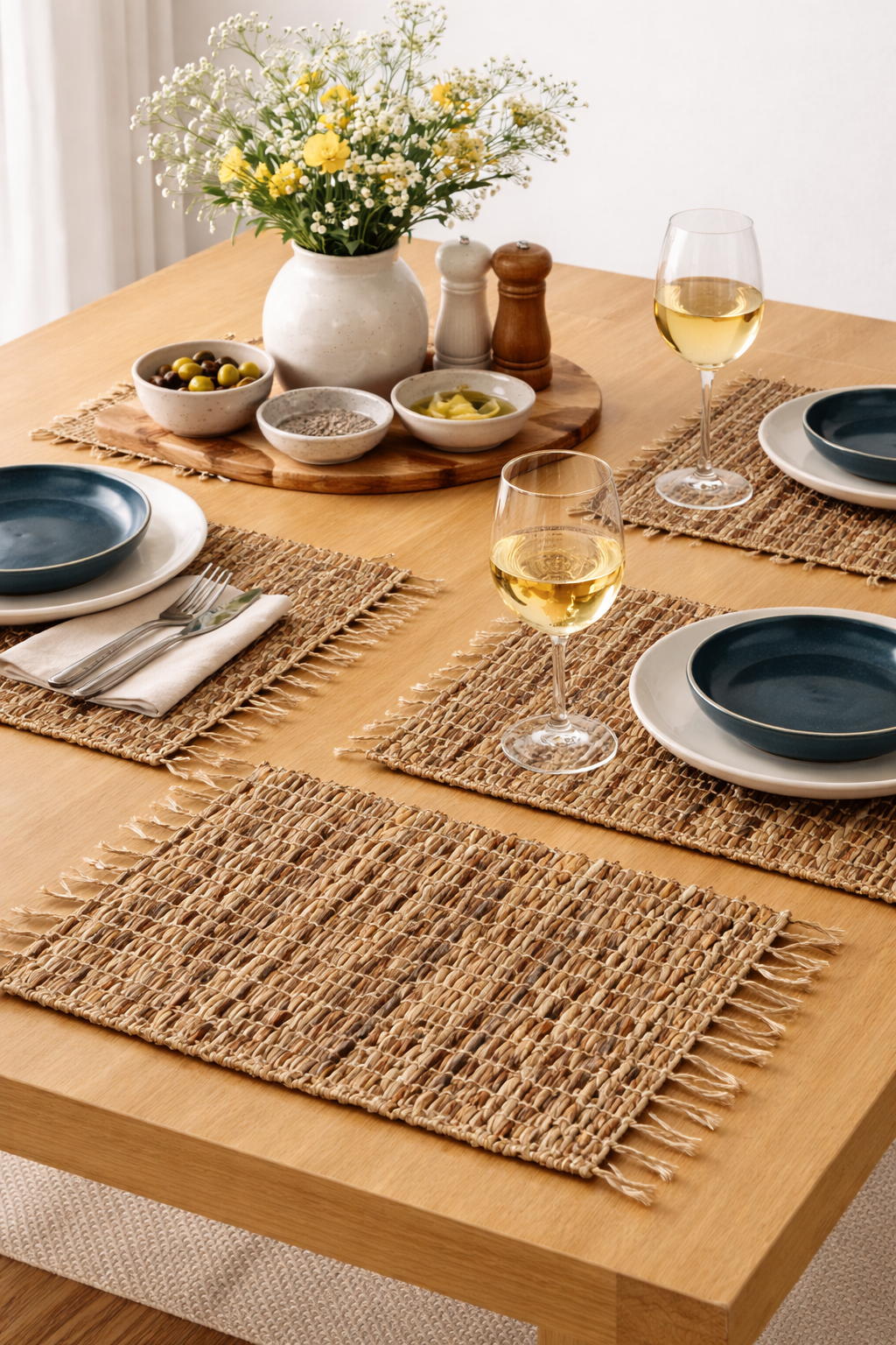 Diskamotta úr vatnshýasintu og með kögri, diskamottan er handofin úr sjálfbærri vatnshýasintu.