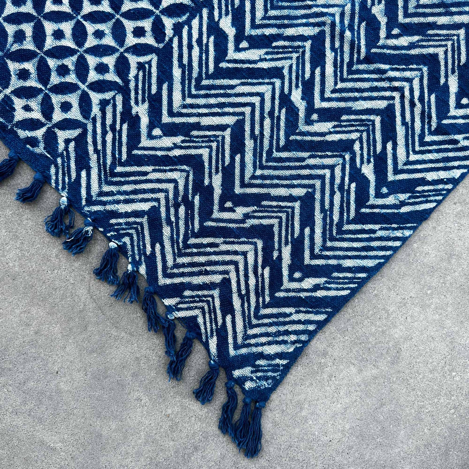 Handgerð Indigo teppi eru afrakstur vandvirks handverks og forna tækni sem hefur verið varðveitt kynslóð fram af kynslóð.